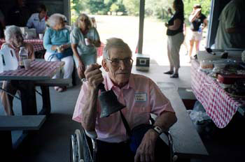 Photo: Walter Hichens, the oldest Ballard attending the 117th Reunion, rings the bell.